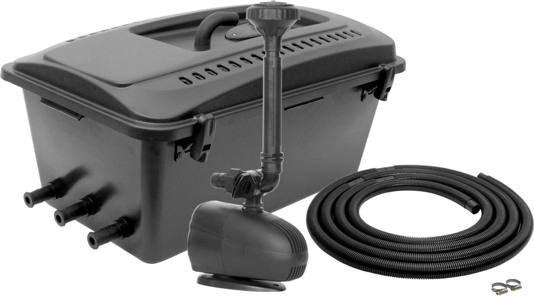 KLARJET-filtersetetet innehåller ett filter, en kompatibel AQUAEL AQUAJET PFN-pump, en trädgårdsslang, bruksanvisning och två jubileumsklämmor. KLARJET-filteruppsättningen innehåller också en UV-steriliserare. Det UV-C-ljus som avges av sterilisatorn bekämpar effektivt alger, bakterier och andra patogener.