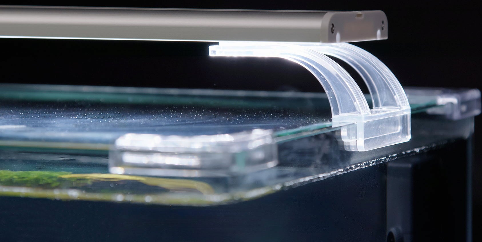 De innovativa, genomskinliga akrylfästena är särskilt praktiska. De gör att lampan nästan flyter och smälter sömlöst in i alla akvariedekorer. Tack vare det smarta glidsystemet kan du flexibelt installera samma LED-lampa i akvarier av olika storlek - lämplig för glastjocklekar på upp till 8 mm.