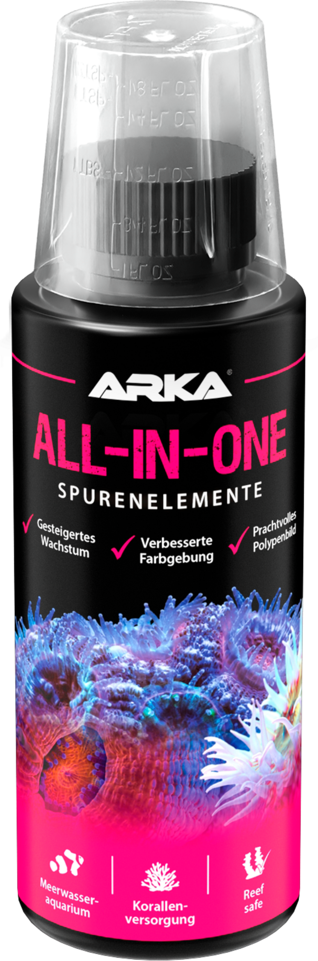 ARKA All-IN-ONE förser korallpolyper, alger och revborrar optimalt med viktiga näringsämnen och spårämnen i det marina akvariet. Ytterligare vitaminer och aminosyror stärker immunförsvaret så att upptaget av spårämnen blir optimalt. Tillväxten av polyper främjas och ger ett vackert utseende. Med All-IN-ONE kan du få ditt marina akvarium att glänsa.