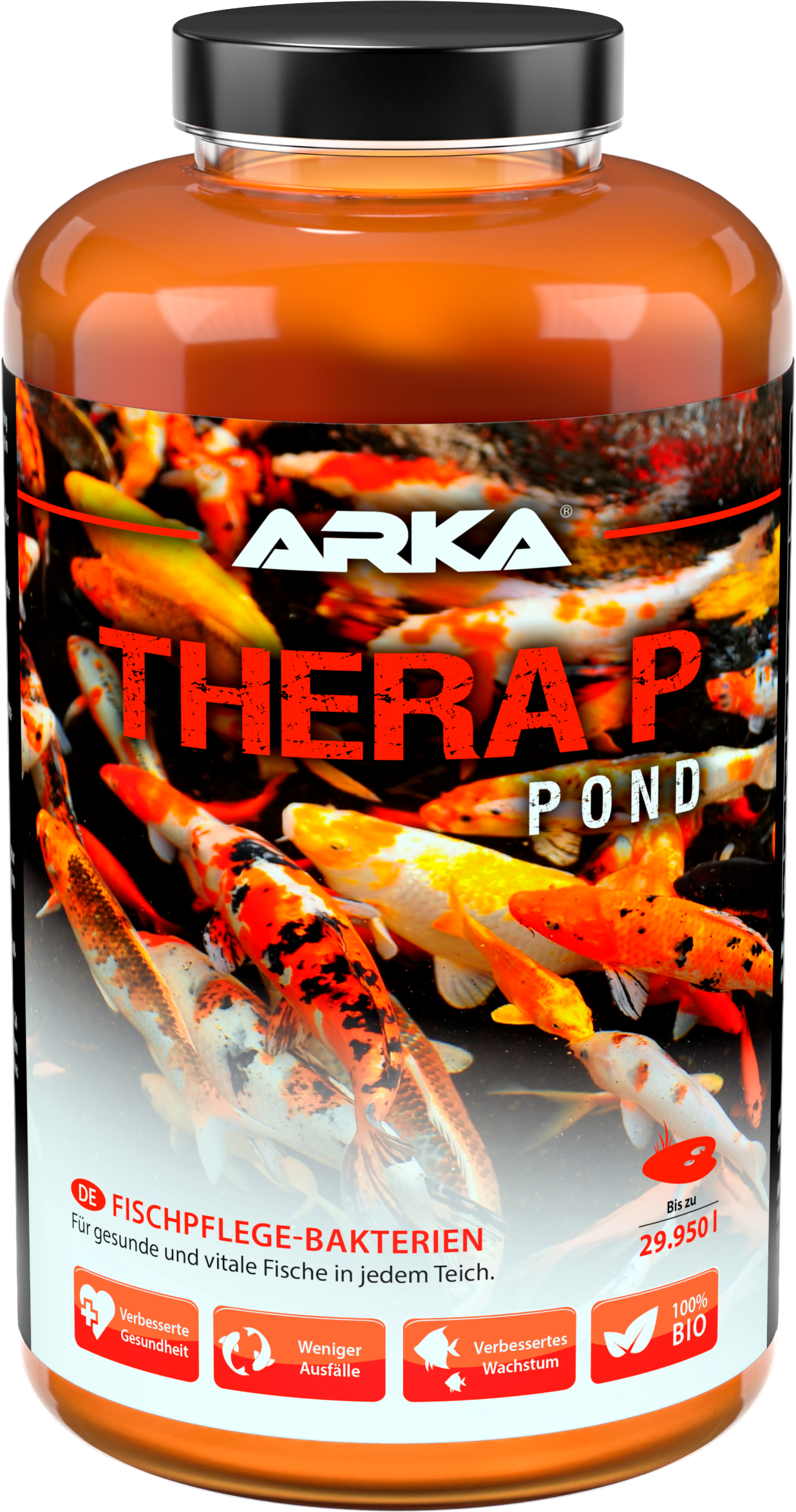 Välbefinnande för dammfiskar: TheraP Pond från ARKA stöder djurens välbefinnande tack vare speciellt utvecklade probiotiska bakterier. De levande organismerna bryter ner organiskt avfall eller utsöndringar och ökar vattnets innehåll av lösta ämnen och syre. Resultatet är att fisken får många fördelar: