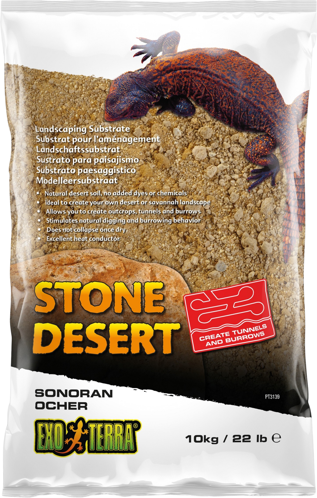 Exo Terra Sonoran Ochre Stone Desert är ett naturligt jordsubstrat för att skapa öken- och savannlandskap. Består av sand, granit och lera, och innehåller inga tillsatta kemikalier eller färgämnen. Förutom dess textur garanteras ökensubstratets äkthet av dess färg: substratets färg motsvarar färgen på det naturliga substratet i en öken.