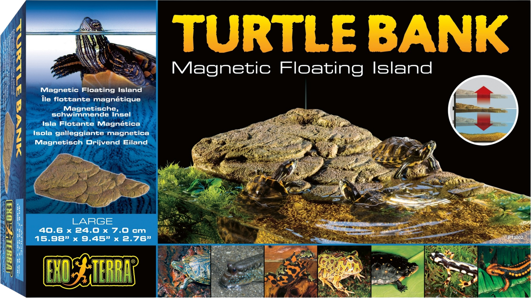 Flytande öformation för vattenlevande sköldpaddor. Sköldpaddsön är placerad i vilket hörn av sköldpaddstanken som helst med hjälp av magnetfäste - den anpassar sig optimalt till alla vattennivåer. Turtle Island har en undervattensramp som gör det lätt för djur att klättra upp på den torra öformationen ovanför vattnet och sola eller koppla av som de vill.
