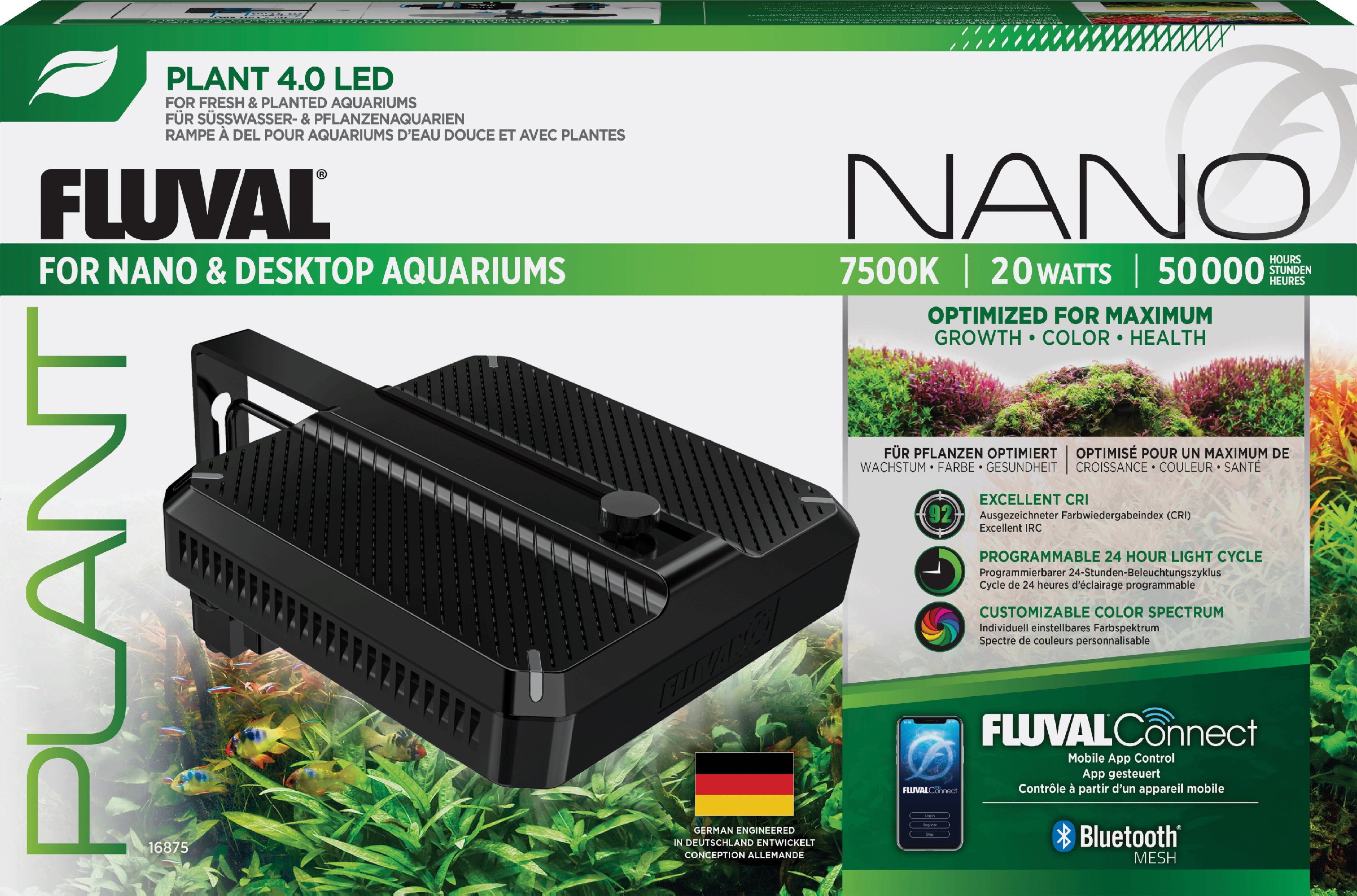 Med Fluval Plant 4.0 Nano LED kan du ge ditt sötvattensakvarium ett professionellt utseende och stödja tillväxten av dina vattenväxter! Med FluvalConnect-appen kan du bekvämt styra 20 watts fullspektrumbelysning via Bluetooth och justera de olika färgkanalerna efter dina individuella behov. Tack vare det utmärkta färgåtergivningsindexet (CRI) kommer dina fiskar och växter att lysa i absolut verklighetstrogna, livfulla färger.