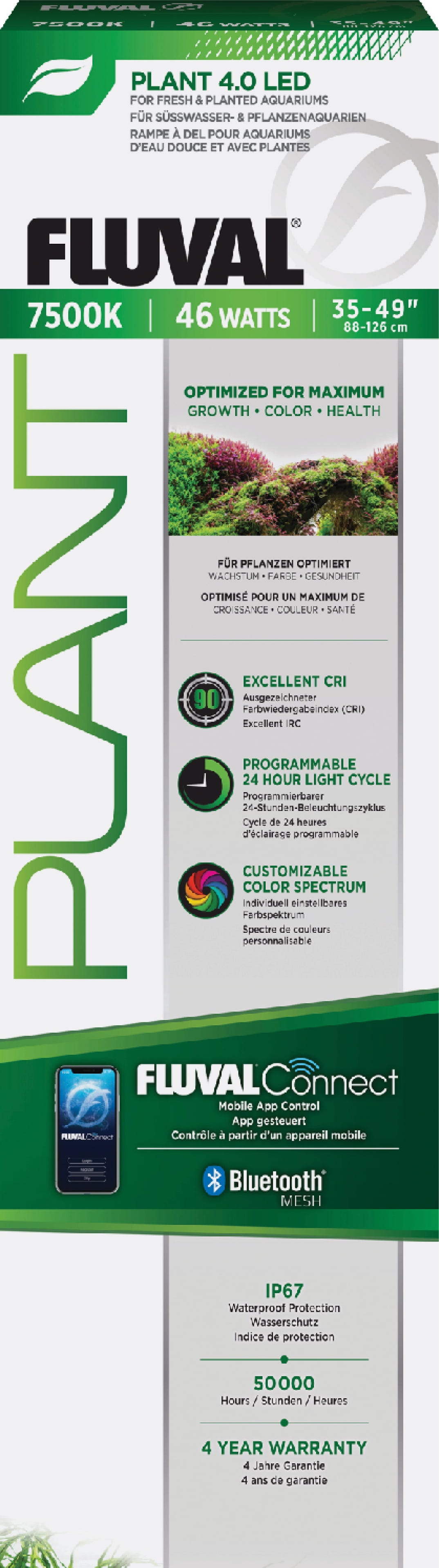 Med Fluval Plant 4.0 LED tar du tillväxten hos dina vattenväxter till en helt ny nivå. Via FluvalConnect-appen styr du det kraftfulla fullspektrumet smidigt från din smartphone och justerar de oberoende färgkanalerna exakt efter dina behov. Unikt är de två LED-panelerna monterade i olika vinklar som ger maximal ljusspridning och minimerar skuggzoner.