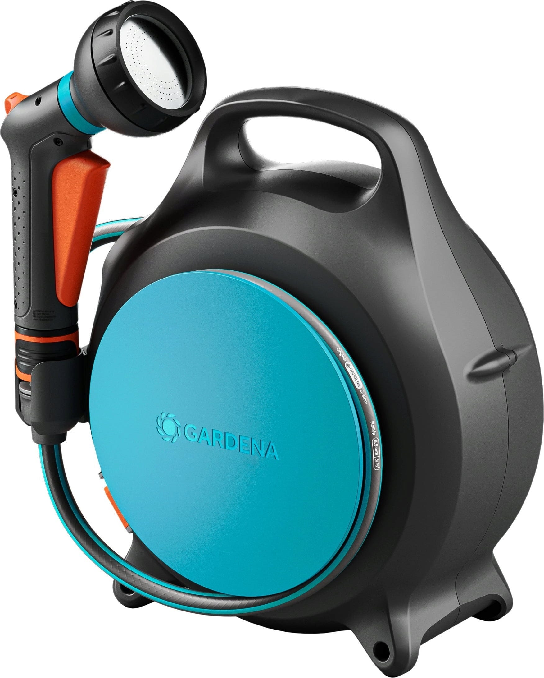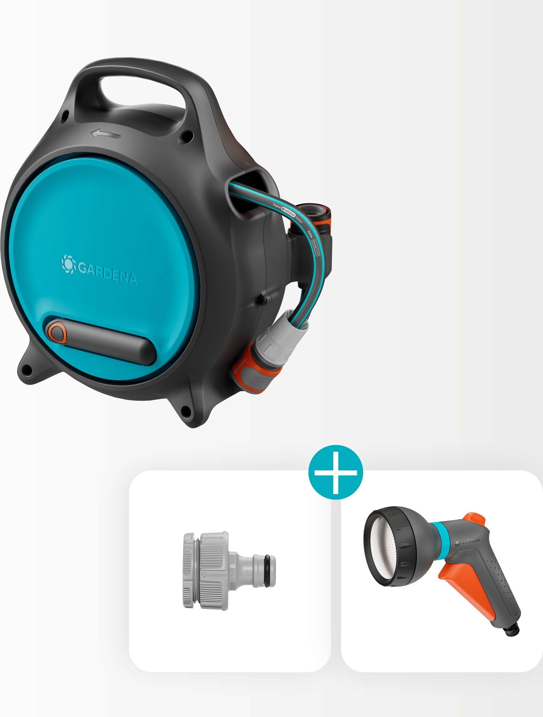 1 x bärbar slangbox Move med 10 m slang (8,5 mm), 1 x Classic sprutmunstycke, 1 x krankoppling med adapter, 1 x redskapshållare