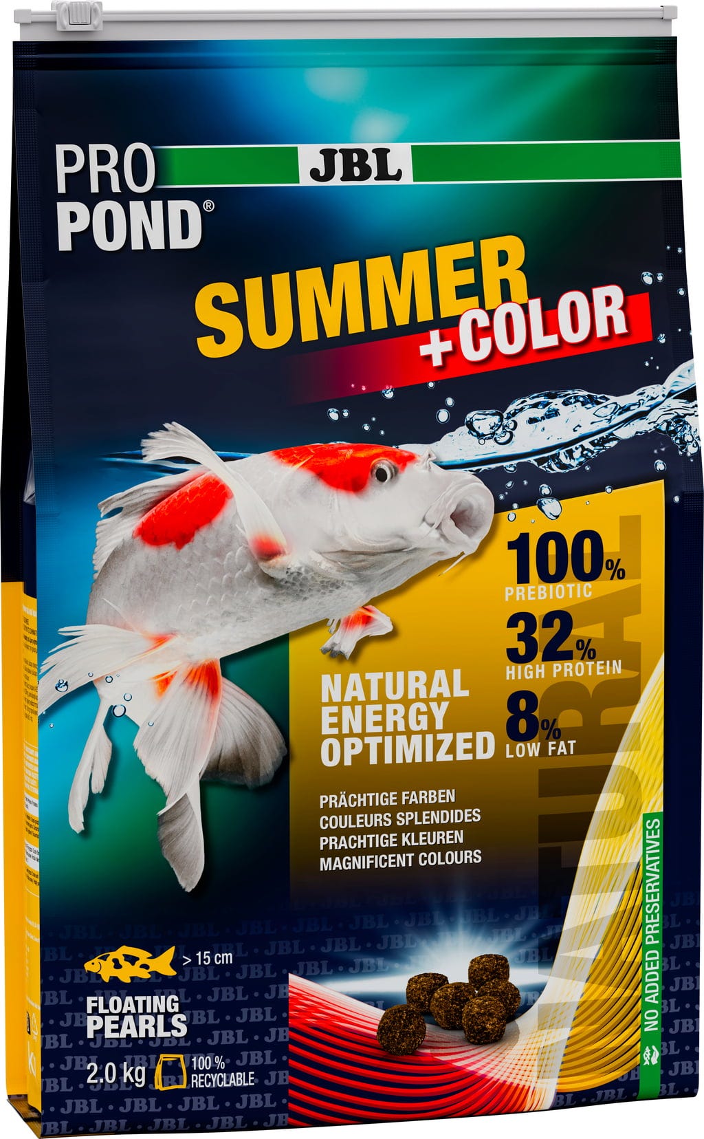 ProPond Summer + Colour från JBL är ett flytande helfoder som är perfekt för koi och andra dammfiskar och har utvecklats speciellt för utfodring under sommaren. Det innehåller krill och räkor och kan stödja utvecklingen av starka färger hos koi.