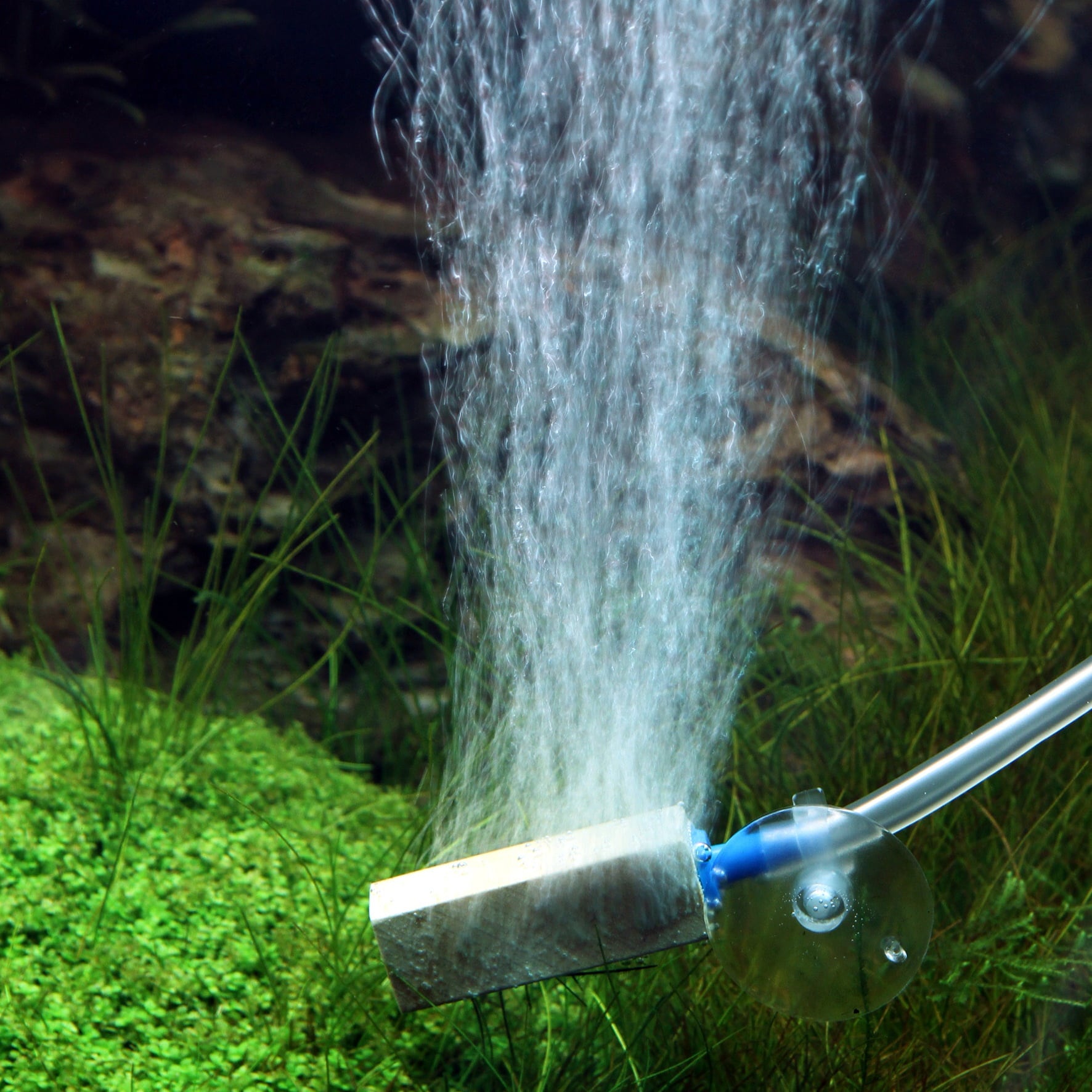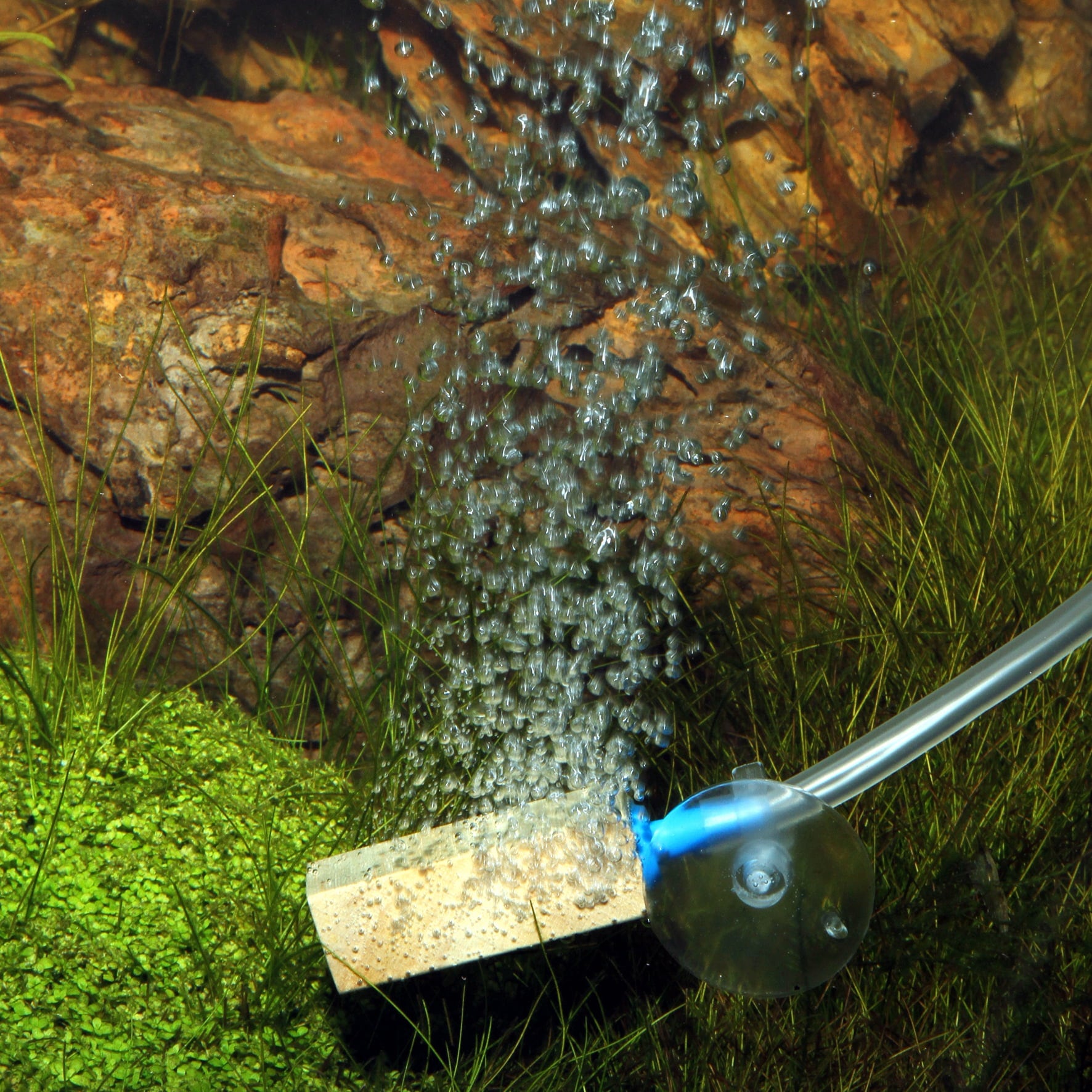 I akvarier med litet ytflöde kan det snabbt uppstå en brist här. Detta beror på att växtmassan också är avgörande: även om många växter producerar livsnödvändigt syre under dagen, andas de också ut koldioxid på natten, eftersom de inte kan fotosyntetisera utan ljus. Särskilt här kan det vara fördelaktigt att använda en luftpump för att undvika onödiga permanenta pH-svängningar under natten, vilket de flesta fiskar har stora problem med. Den resulterande vattenrörelsen driver aktivt ut (överflödig) koldioxid och atmosfäriskt syre kommer in i akvarievattnet.