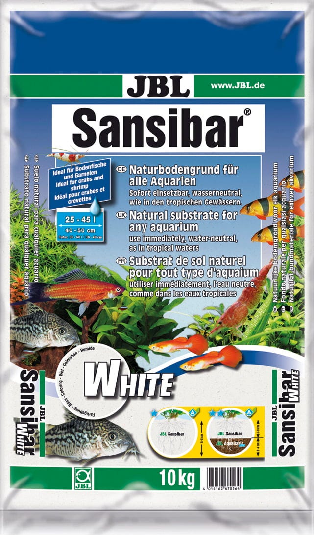 JBL Sansibar White är ett naturmaterial för alla akvarier och är särskilt lämpligt för bottenlevande djur, eftersom denna fina rundade kvartssand även förekommer i deras naturliga miljöer. Hos fiskar som pansarmalar och botior skyddas de känsliga skäggtömmarna. Den fina kornstorleken och täta strukturen förhindrar att smuts och avfall tränger ner och motverkar därmed nedbrytningsprocesser som kan hämma växternas tillväxt. För bästa växtresultat rekommenderas JBL AquaBasic plus långtidsnäring med JBL Sansibar White som topplager. JBL Sansibar White avger varken hårdhetsbildande ämnen eller oönskade silikater till akvarievattnet.