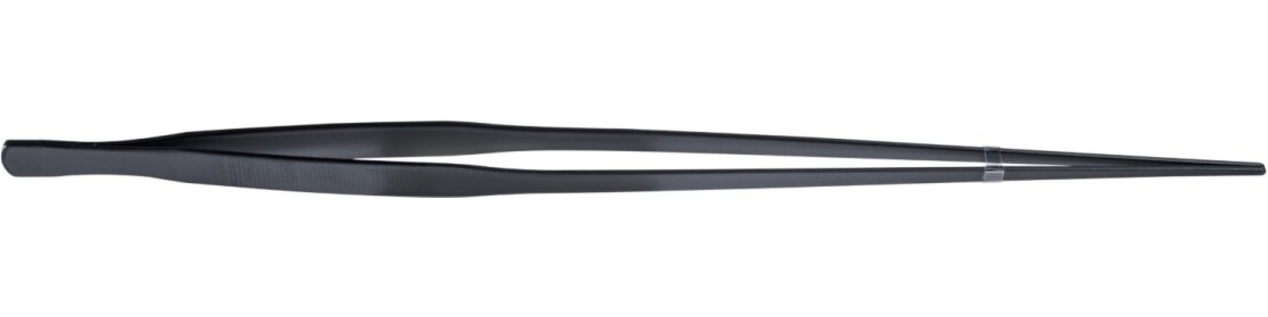 Pincetten är tillverkad av slitstarkt, rostfritt stål och har en elegant svart beläggning. Denna yta ger ett professionellt intryck och förbättrar greppet under arbetet.