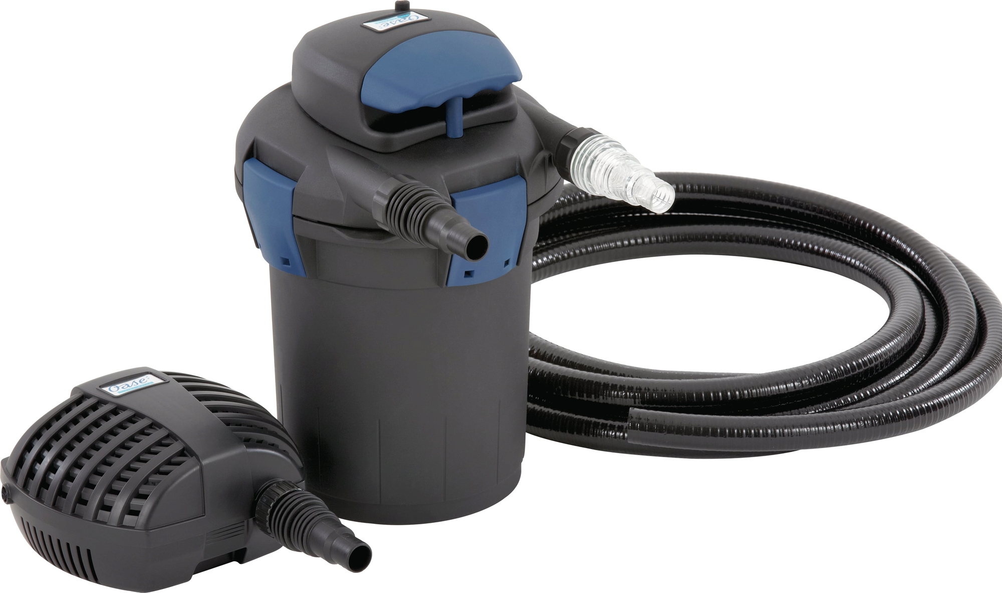 - Försedd med: 4,5 m3/4" (19 mm) slang och Oase filterpump 1500 (25 W; 1500 l/h Qmax; 1,9 m Hmax