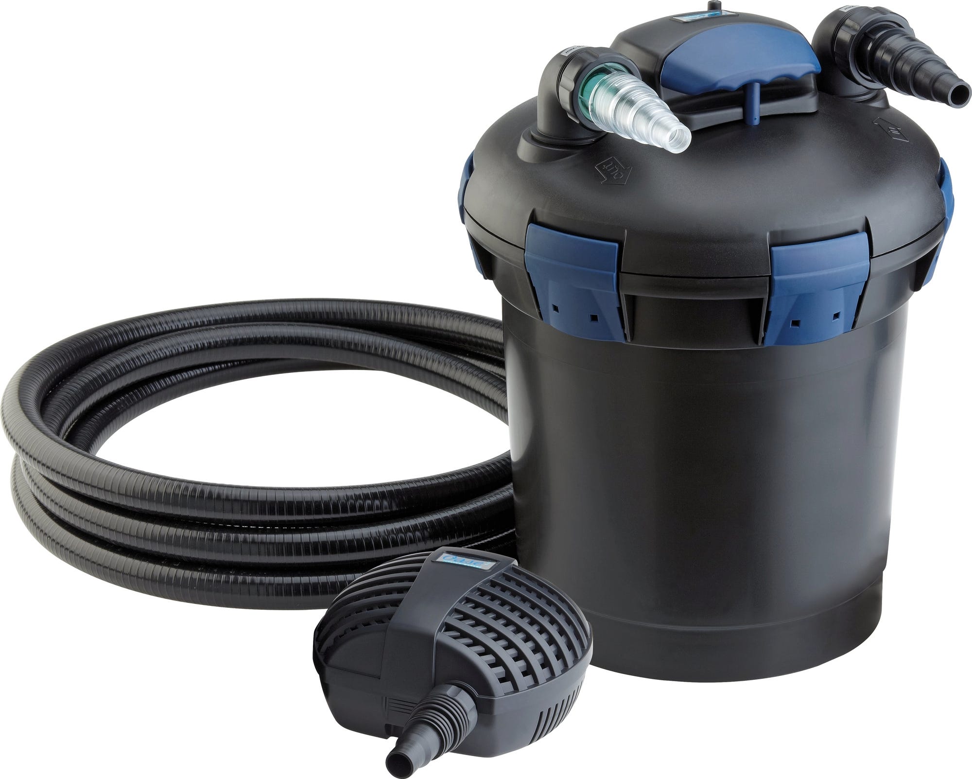- Försedd med: 4,5 m3/4" (19 mm) slang och Oase filterpump 1500 (25 W; 1500 l/h Qmax; 1,9 m Hmax
