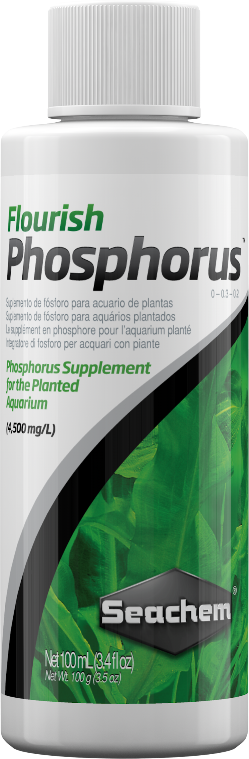 Använd 2,5 ml Flourish Phosphorus™ per 80 liter akvarievatten en eller två gånger i veckan. Fosforhalten bör ökas med 0,05 mg/l (för jämförelse: ideala fosfatvärden ligger mellan 0,15 och 1,0 mg/l).