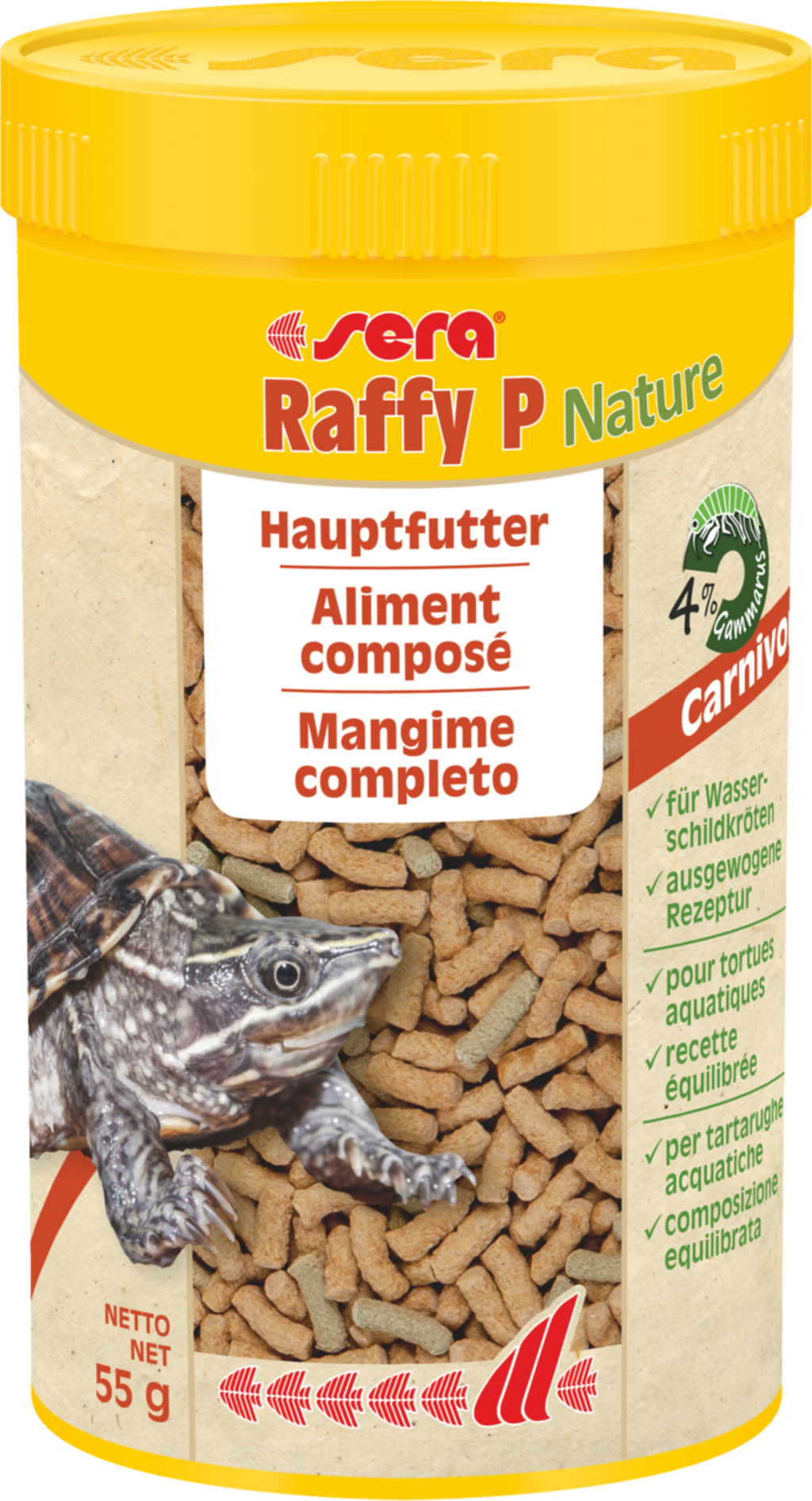 Sera Raffy P Nature är ett basfoder av flytande, försiktigt producerade granulat för köttätande reptiler som vattensköldpaddor.