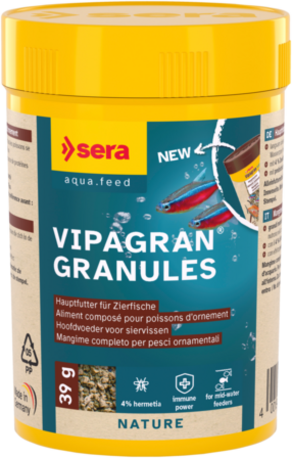 sera Vipagran Granules är ett långsamt sjunkande och universellt basföda i granulatform, särskilt för fiskar med små munnar och smala matstrupar i mellansjözonen. Granulatet med prebiotisk effekt kännetecknas av högsta kvalitet och främjar hälsa och välbefinnande på bästa sätt. Tack vare den utmärkta acceptansen tack vare partiklarnas mjuka och smidiga struktur och den goda smältbarheten förblir vattnet klart och oförorenat. I synnerhet använder sera havsfiskmjöl från färsk hel fisk från hållbart fiske - ingen ätbar fisk! Tillsatsen av hönsäggs- eller mjölkprotein, som förbättrar konsistensen och som dessutom är utmärkt smältbart (trots att det kommer från jorden), kompletterar proteintillförseln på bästa sätt.
