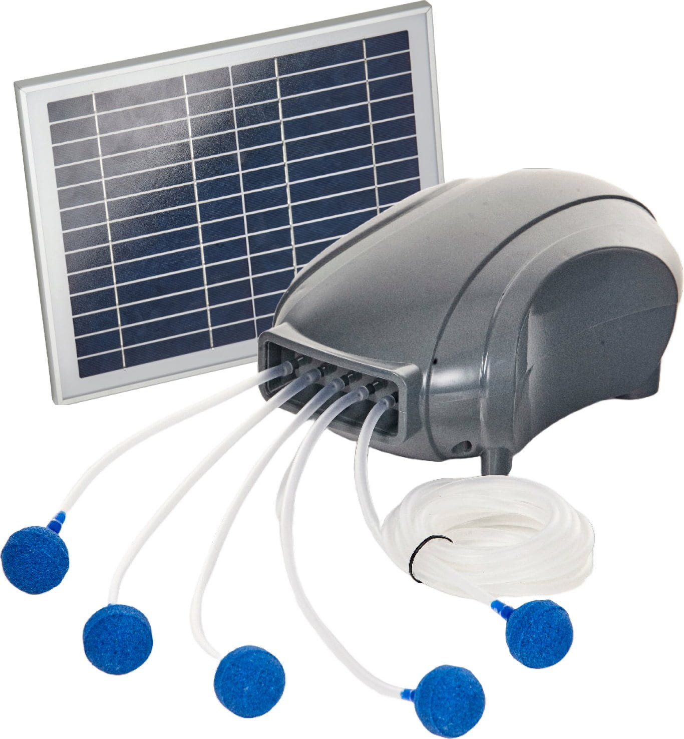 HEISSNERs solcellsdammluftare erbjuder en miljövänlig och eloberoende lösning för syreberikning i dammar med ett vattendjup på upp till 1,5 meter. Systemet använder en kraftfull solpanel för att förse luftarpumpen direkt med energi - perfekt för platser utan fast strömanslutning. Den riktade lufttillförseln och vattencirkulationen stabiliserar den biologiska balansen, hämmar algtillväxten och skapar en hälsosam livsmiljö för fiskar och växter.