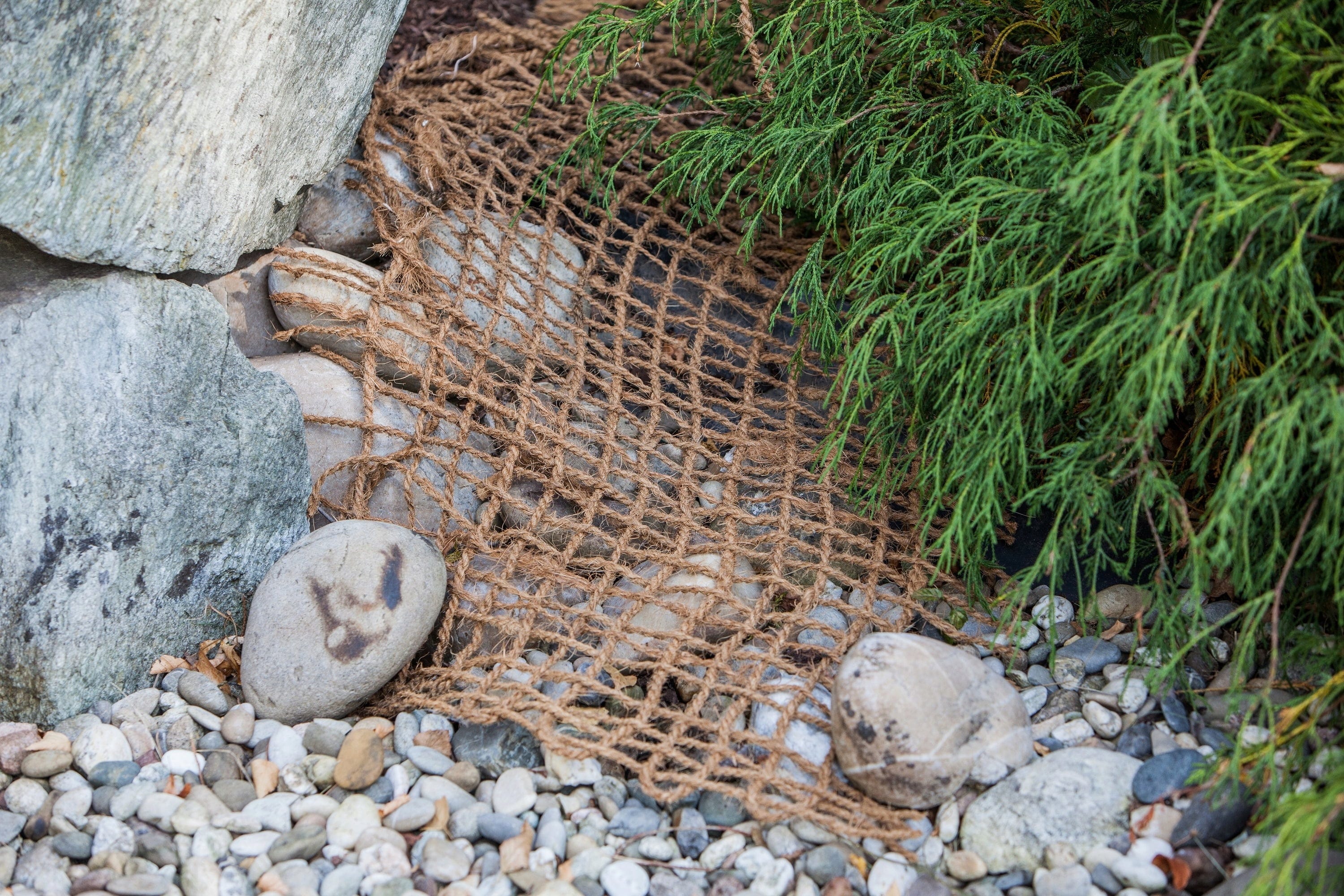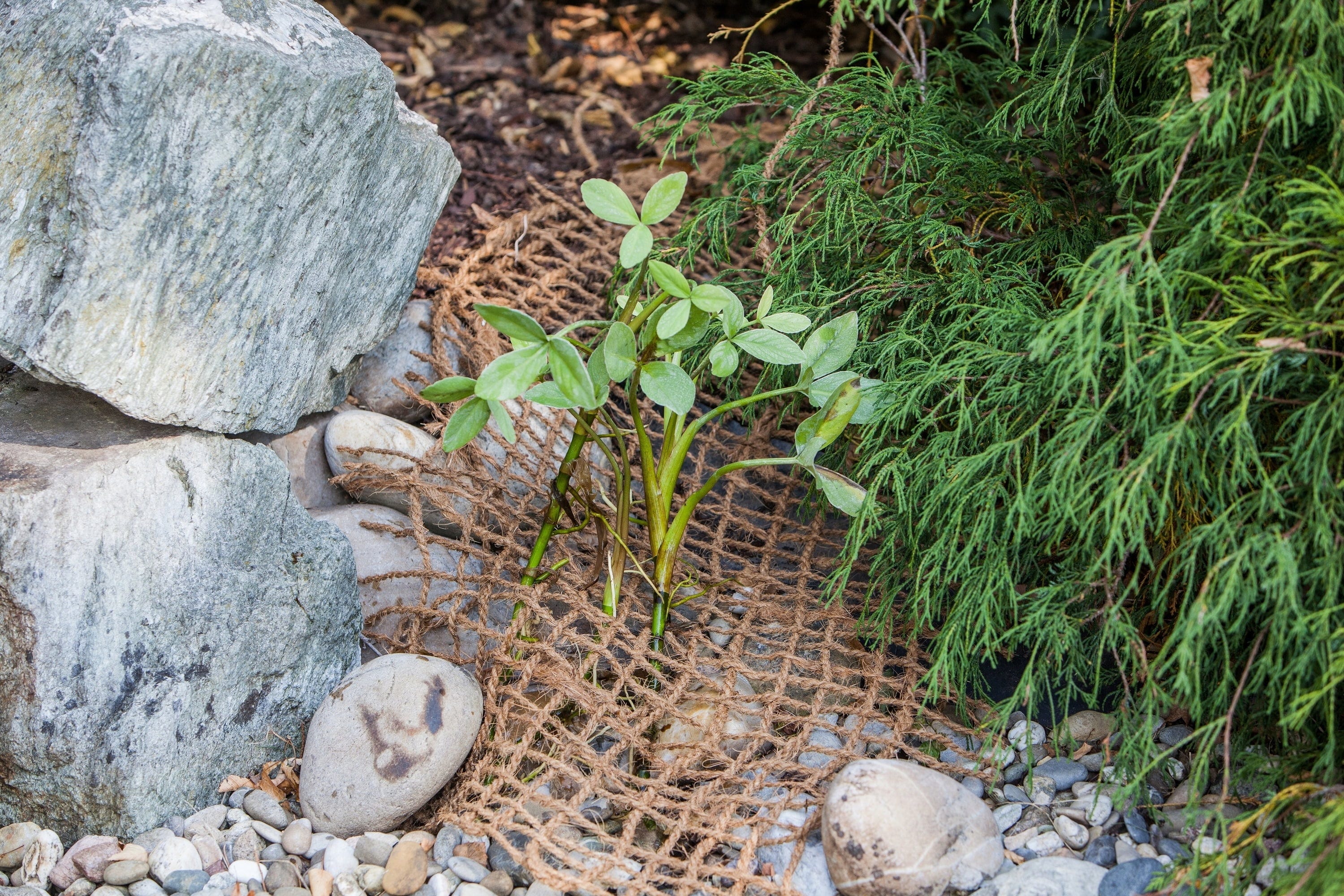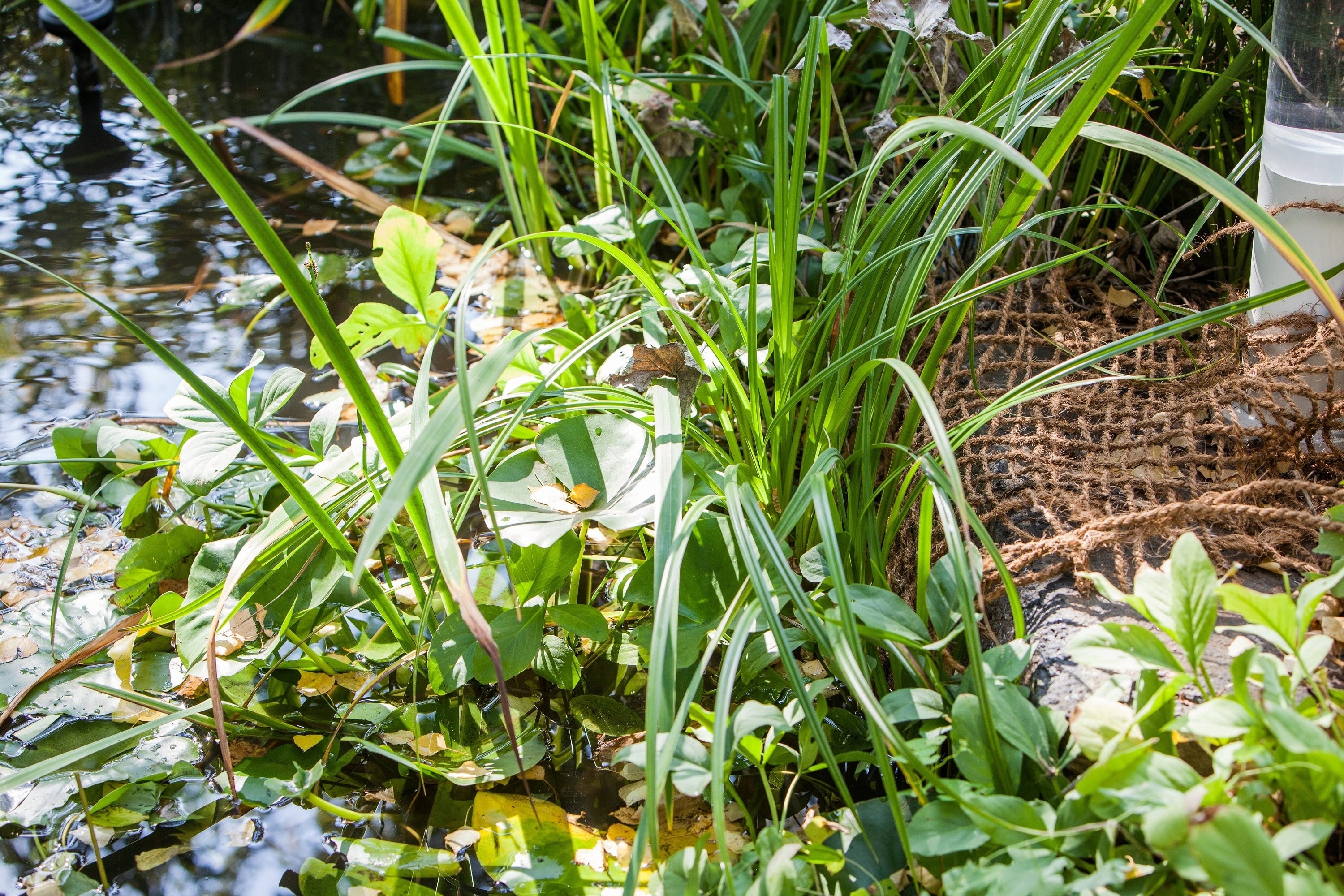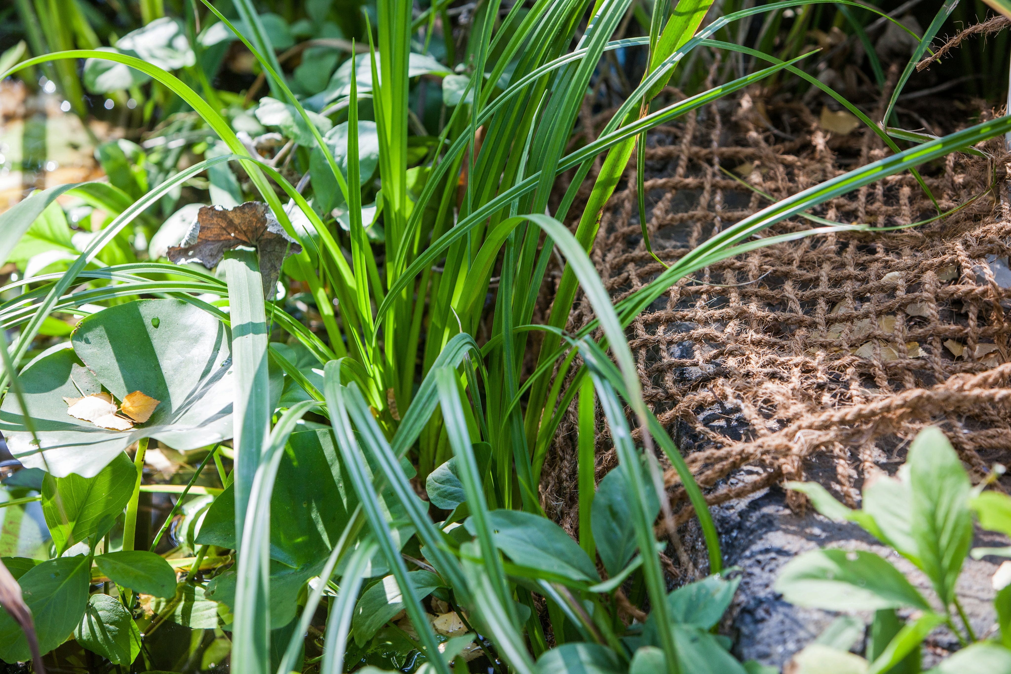 HEISSNER strandplanteringsmatta i naturligt kokosmaterial löser utmaningen med branta slänter genom att ge växter ett stabilt fäste även på annars kala ytor. Det grovmaskiga nätet fungerar som ett naturligt underlag som påskyndar rotbildningen och samtidigt effektivt förhindrar att substrat glider ner i djupare delar av dammen.