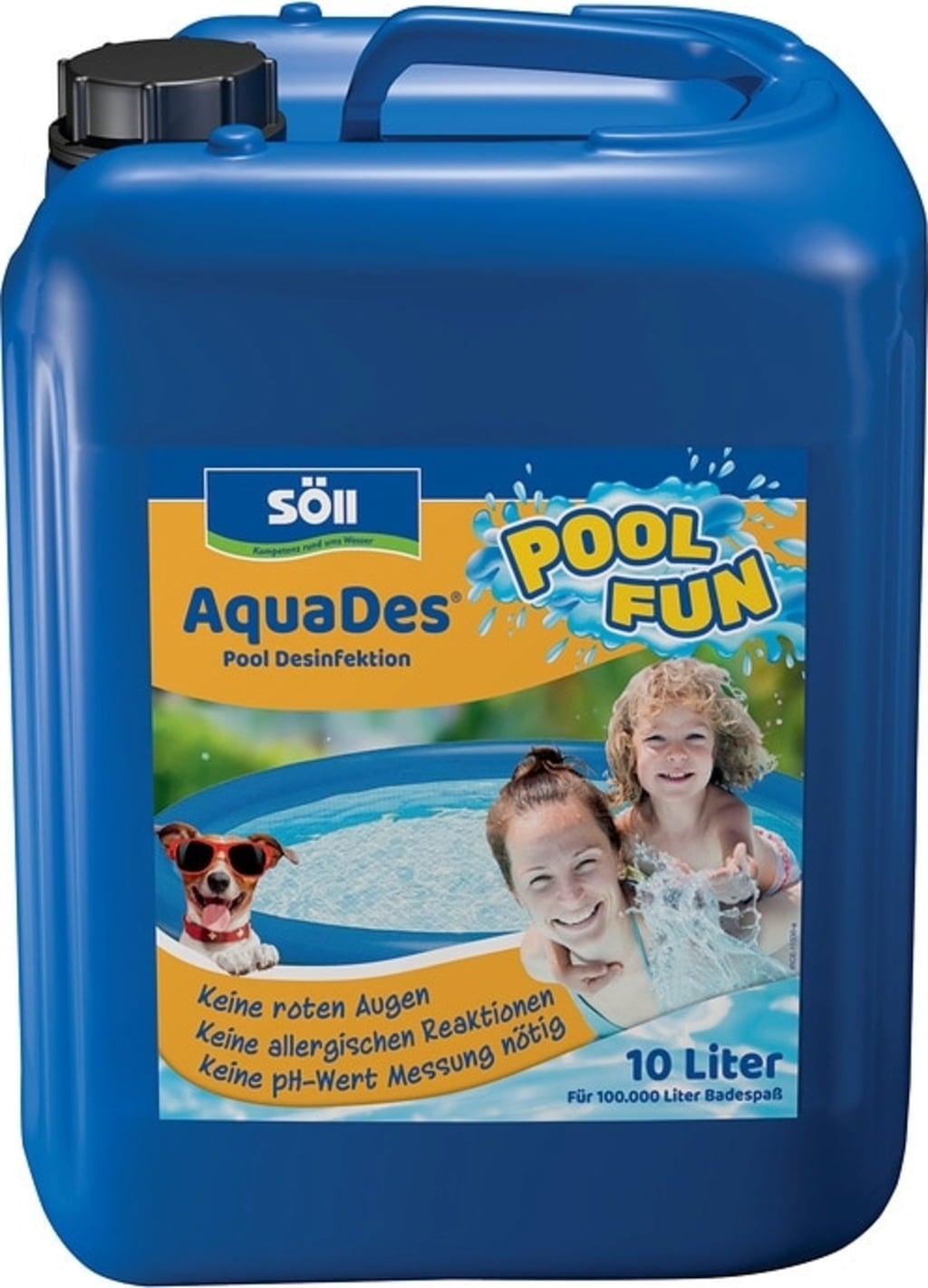 AquaDes från Söll är en riktig sommarhit! 1 liter av desinfektionsmedlet räcker till 10 000 liter badvatten!