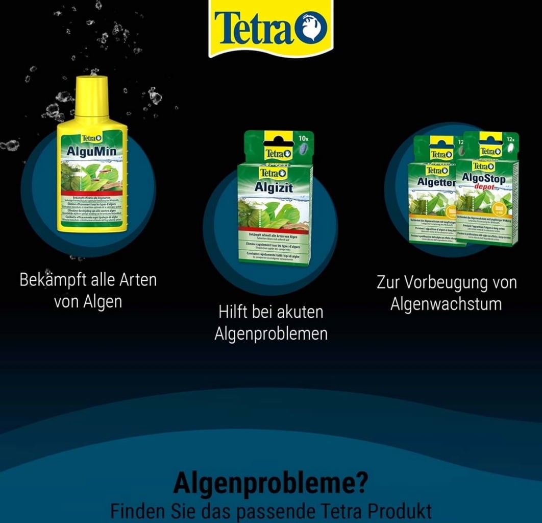 Redan efter 4–7 dagar minskar mängden alger tydligt, och ny algbildning förhindras. Tetra Algetten levereras i en praktisk doseringshållare för långtidsanvändning. Produkten är säker att använda i akvarier med fiskar, växter och mikroorganismer.