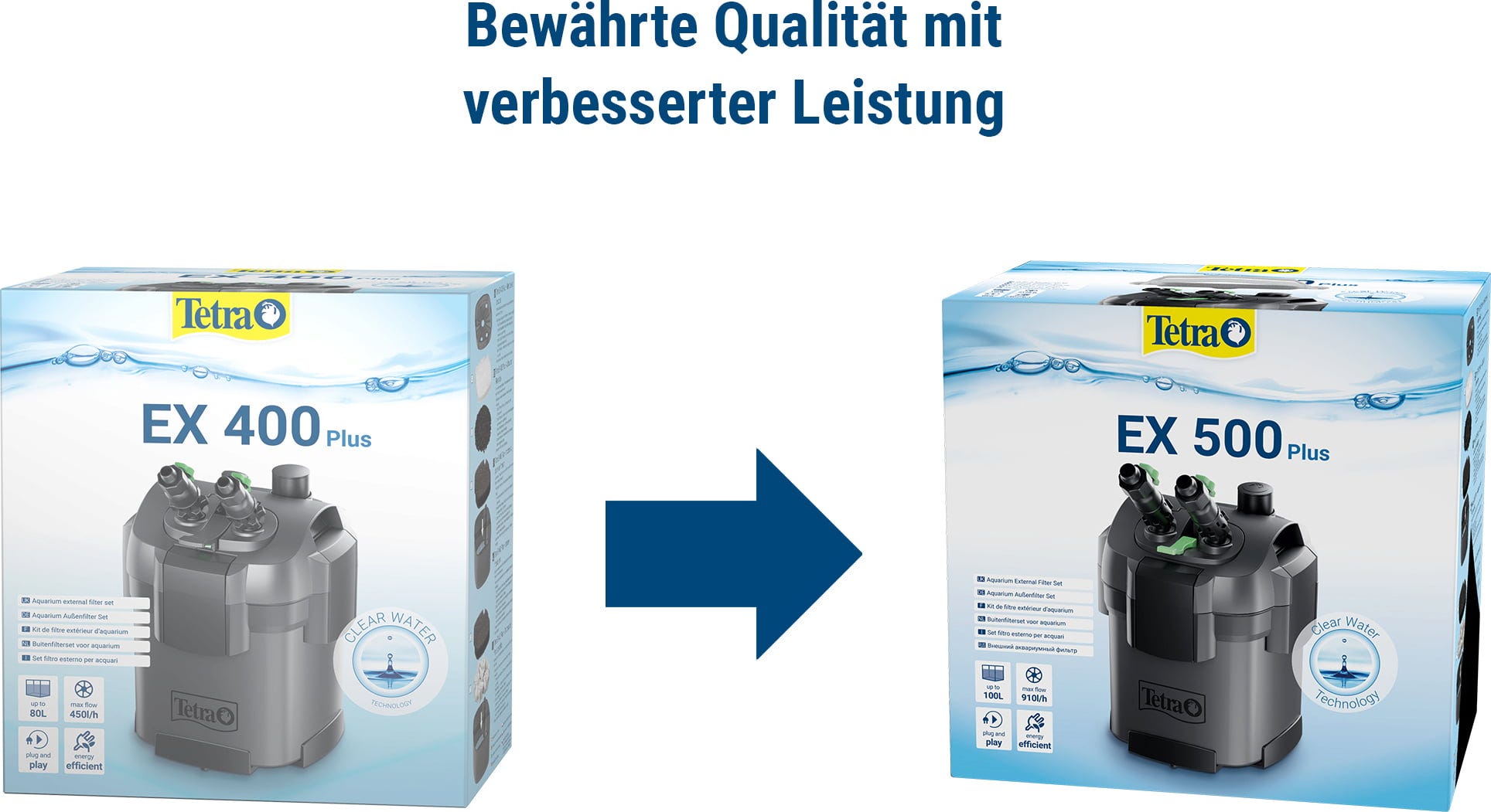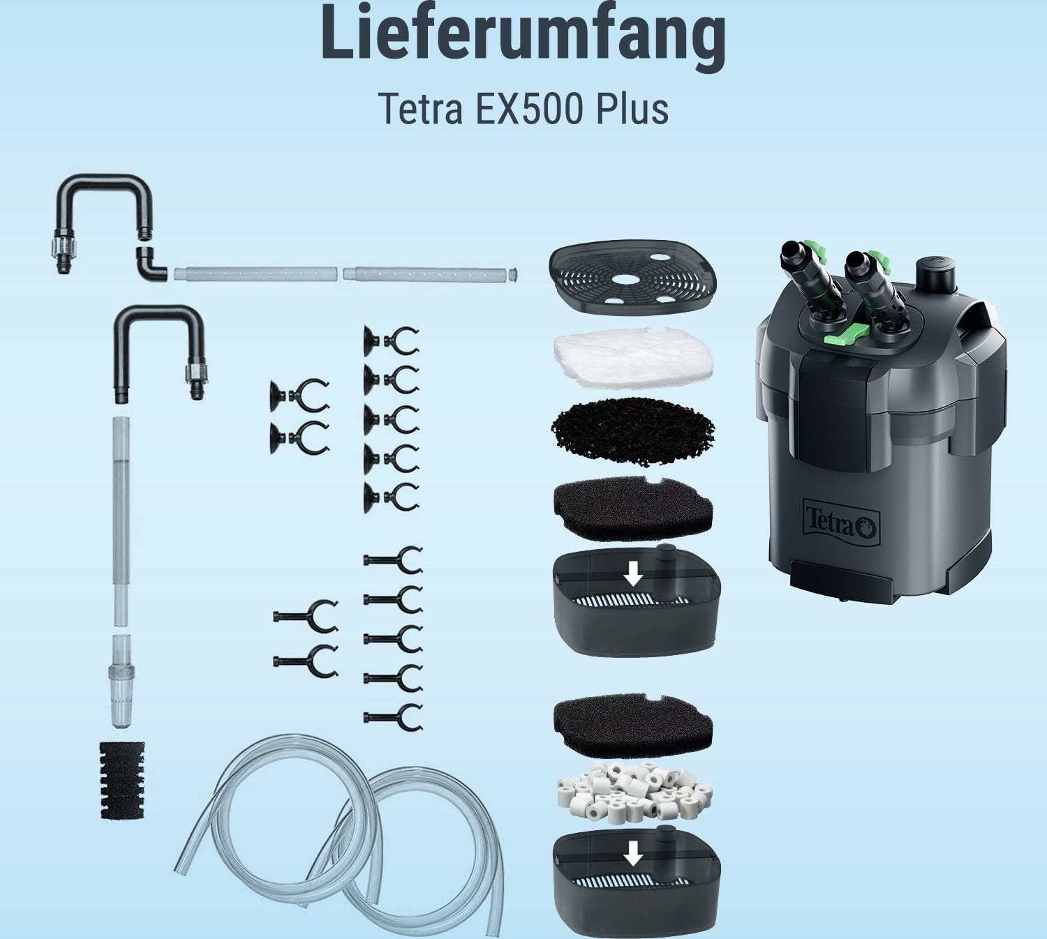 Det förbättrade Tetra EX Plus-komplettsetet ger dig ett kraftfullt externt filter och säkerställer optimala vattenförhållanden för dina fiskar och växter. Tack vare det stora leveransomfånget är filtret redo för omedelbar användning!