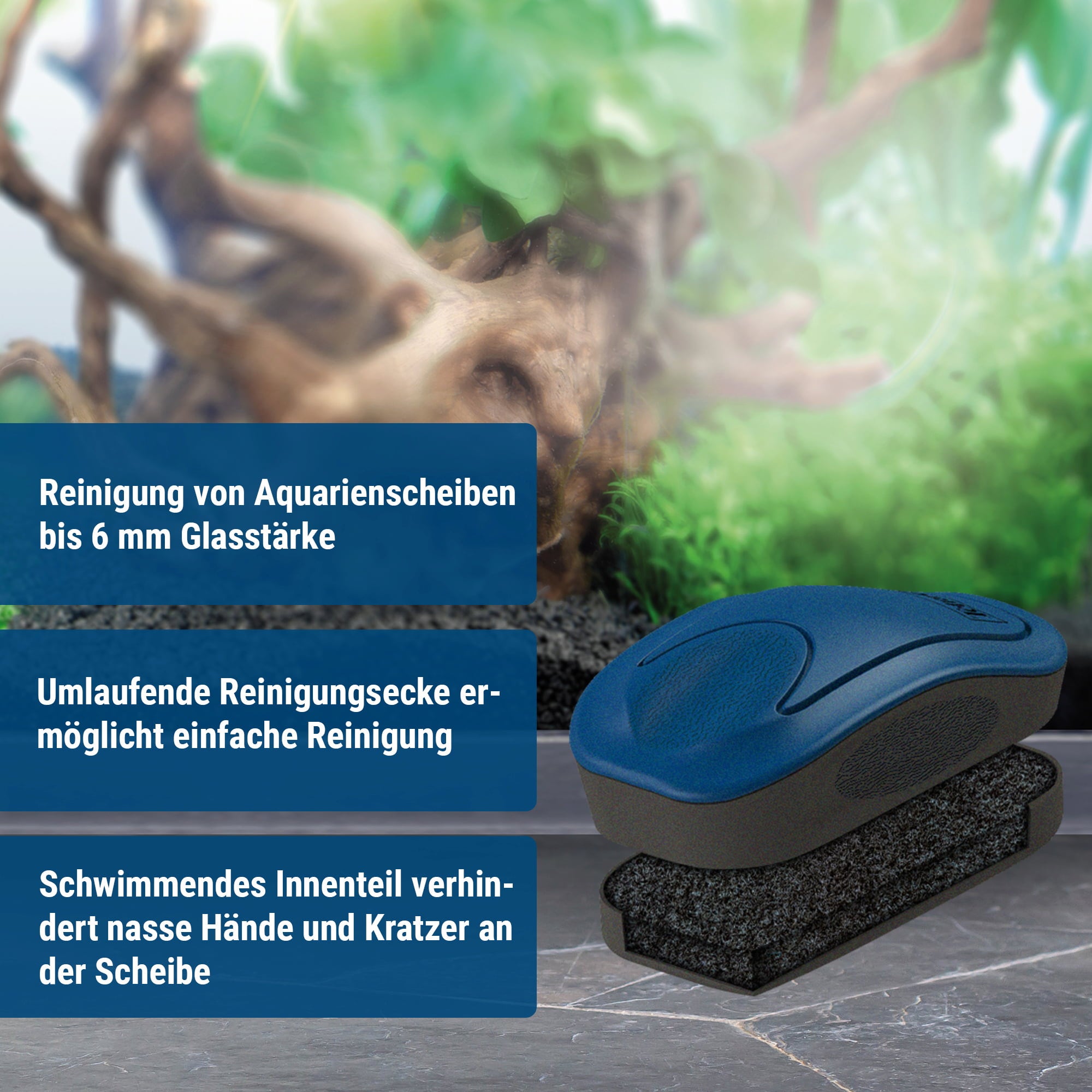 Magnet Cleaner är perfekt för raka glas eller Magnet Cleaner Bowl för runda akvarieglas. Rengöringshörnet gör det särskilt lätt att rengöra akvariets hörn som annars är svåra att nå. Den halkfria ytan garanterar bekväm rengöring och den ergonomiska formen garanterar att den magnetiska rengöringsmaskinen ligger perfekt i handen. Dessutom förhindrar den flytande inre delen våta händer eller repor från stenar som har lagt sig mellan skivan och den inre delen av substratet, om kontakten skulle gå förlorad.