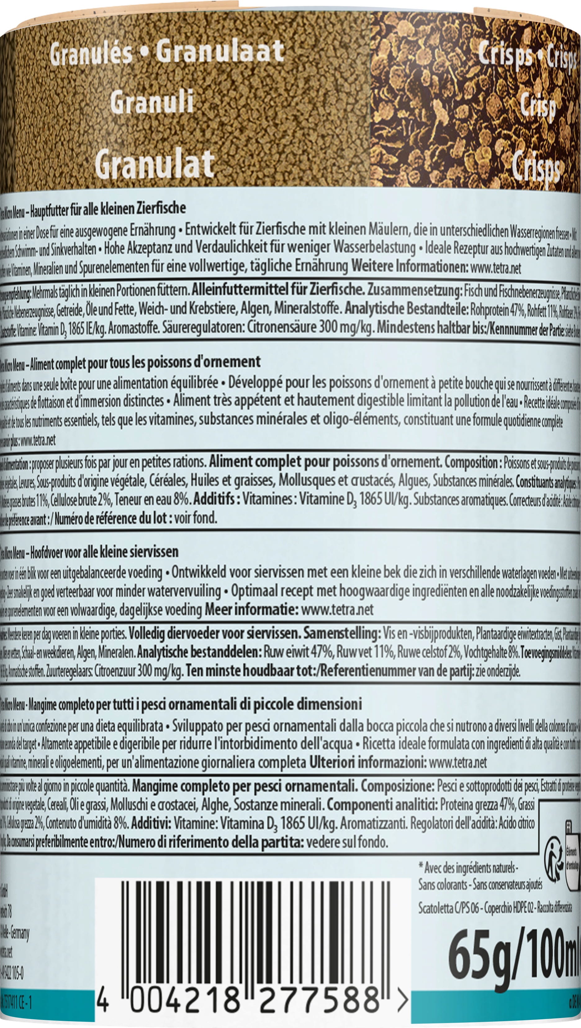 Med det nya Micro-sortimentet visar Tetra återigen sin innovationskraft: tack vare innovativa produktionsprocesser innehåller de fyra nya sorterna alla de näringsämnen som små fiskar med små munnar behöver i den minsta presentationsformen. Granulat, pellets, pinnar och chips har olika flyt- och sjunkegenskaper - för artanpassad utfodring av fiskar i olika vattenområden. Med en så fin struktur och storlek är det ännu viktigare att varje matpartikel innehåller rätt mängd högkvalitativa proteiner, fetter, vitaminer och mineraler för att hålla djuren friska och välmående. Det är därför Tetra-experterna har utvecklat detta mikrofoder. Tack vare diametern på 0,3 och 2,5 mm tränger sorterna snabbt igenom och kan snabbt tas upp av Guppy, Microrasbora och Co. De innehåller finmalda ingredienser, t.ex. karotenoider som ger ljusa färger, samt vegetabiliska ingredienser för hälsa, vitalitet och för att stärka immunförsvaret. Tetra Micro Menu är den perfekta lösningen för utfodring av små sötvattenfiskar! Den praktiska doseringsburken har en vridbar lock för att göra det enkelt att välja mat. Maten kan ibland kompletteras med godis, t.ex. med Tetra FreshDelica-sorter.