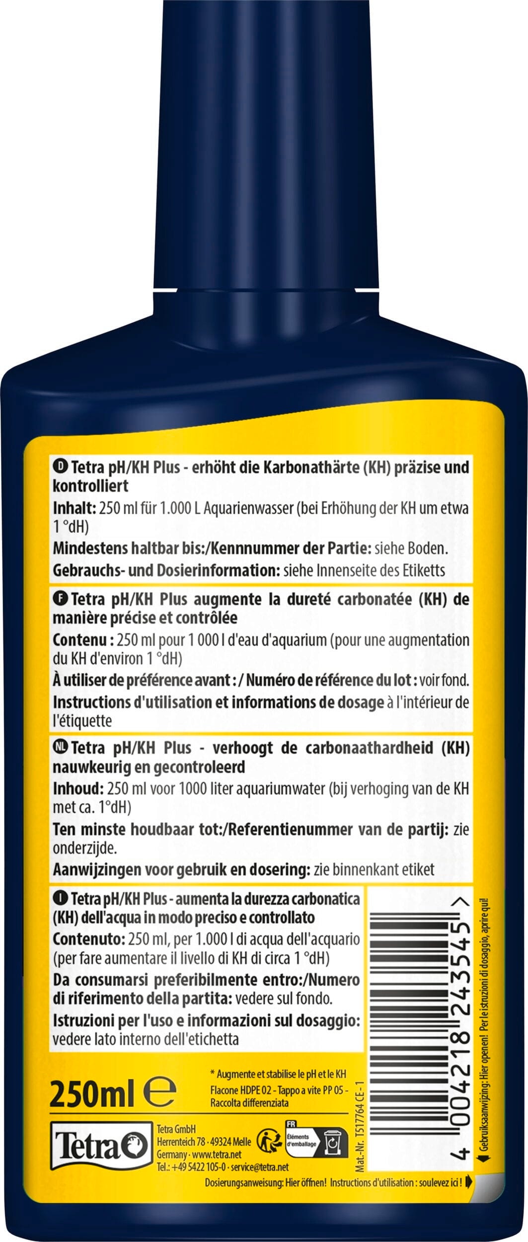 - För att höja karbonathårdheten (KH) i akvarievattnet med ca 1 °dH tillsätter du 5 ml Tetra pH/KH Plus till var 20:e liter akvarieinnehåll.