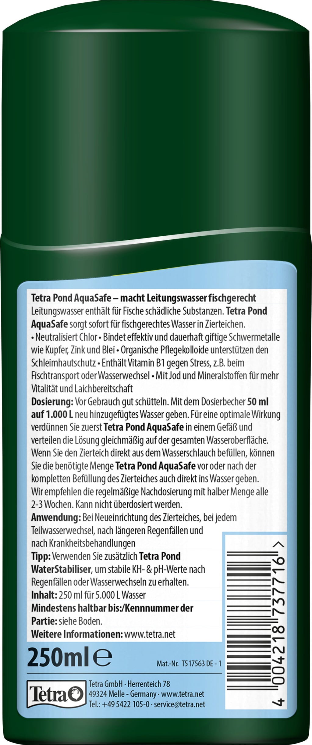 Tetra Pond AquaSafe säkerställer naturligt dammvatten som är lämpligt för fiskar. På grund av underhållsåtgärder som vattenbyten eller den naturliga avdunstningsprocessen är det nödvändigt att tillsätta kranvatten till dammen då och då. Eftersom vårt kranvatten är avsett för mänsklig konsumtion innehåller det klor för att desinficera de bakterier det innehåller. Den speciella kombinationen av aktiva ingredienser ger omedelbart och varaktigt skydd för tre dammar: den binder effektivt och permanent giftiga tungmetaller som koppar, zink och bly, neutraliserar aggressivt klor som kan leda till skador på gälarna, och organiska kolloider ger djuren ett varaktigt skydd mot sjukdomar. Vitamin B1 motverkar stress, t.ex. vid transport av fisk, jod och mineraler ger ökad vitalitet och ökar lekvillkoren. Tetra Pond AquaSafe skapar optimala förutsättningar för kolonisering av mikroorganismer som har en denitrifikationsverkan.