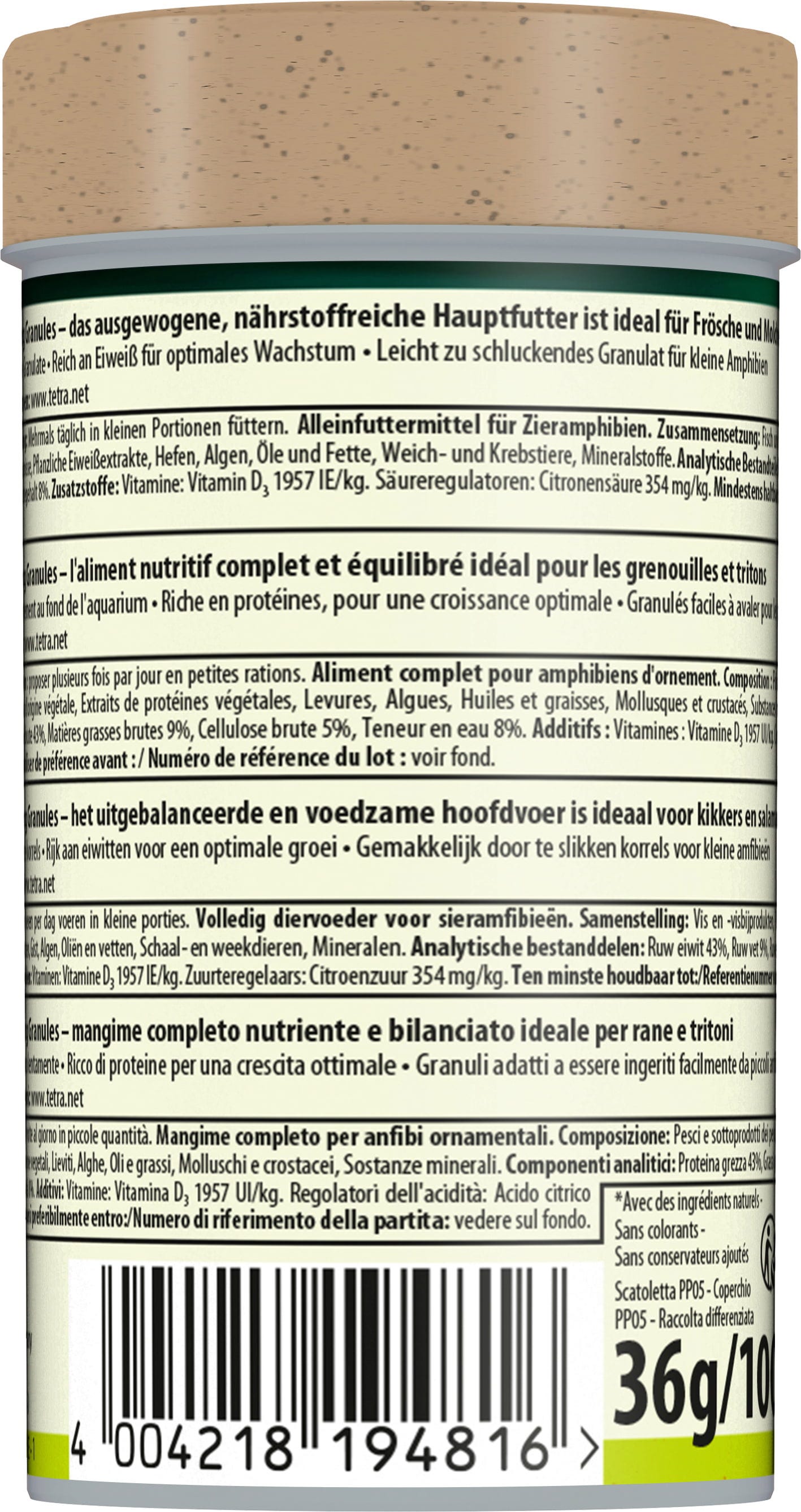 Tetra ReptoFrog Granules är ett huvudfoder för vattenlevande grodor och vattensalamandrar. De lättsvalda granulaten är en bra proteinkälla och rika på protein som ger optimal tillväxt. På grund av sin lilla storlek är den också mycket lämplig för små amfibier