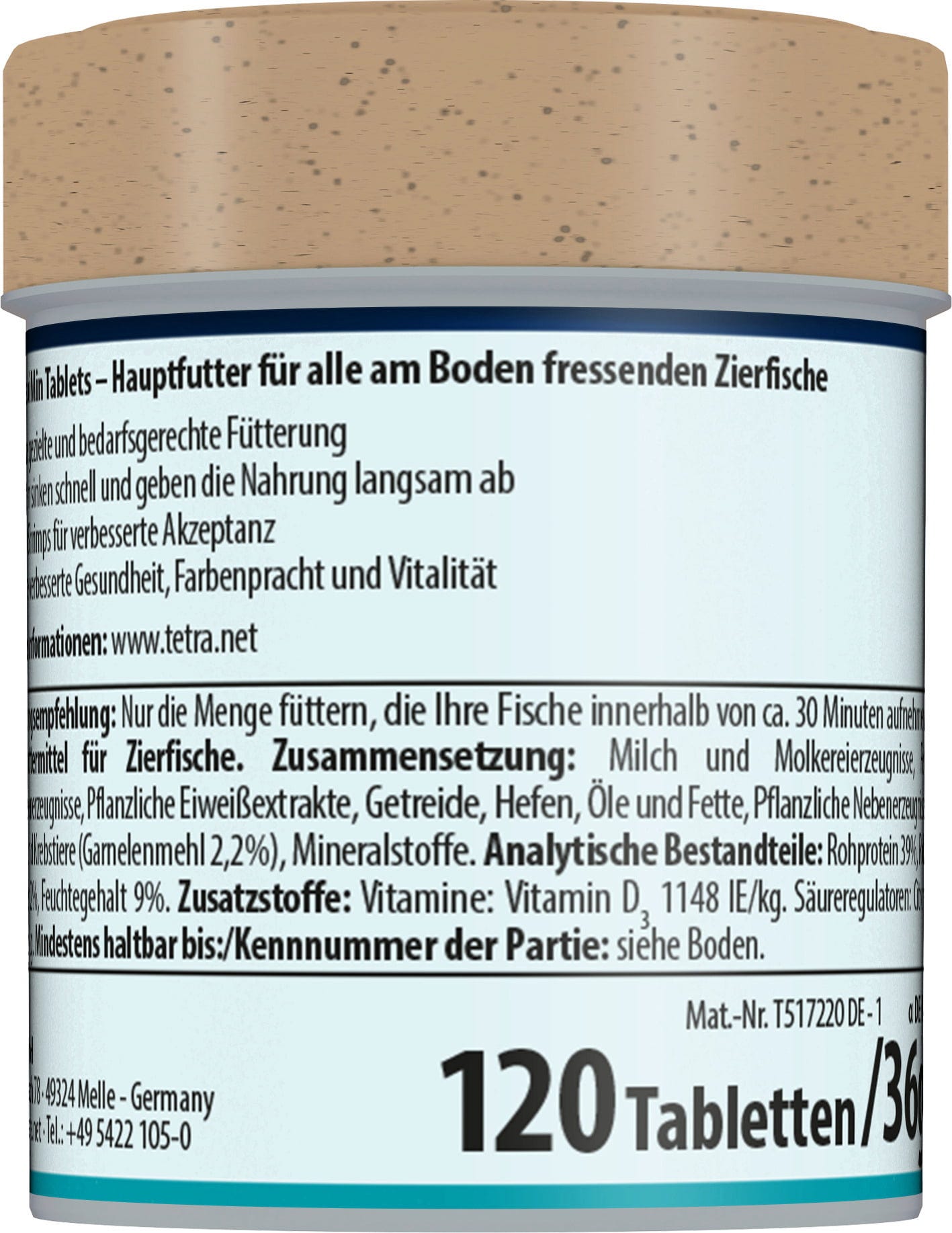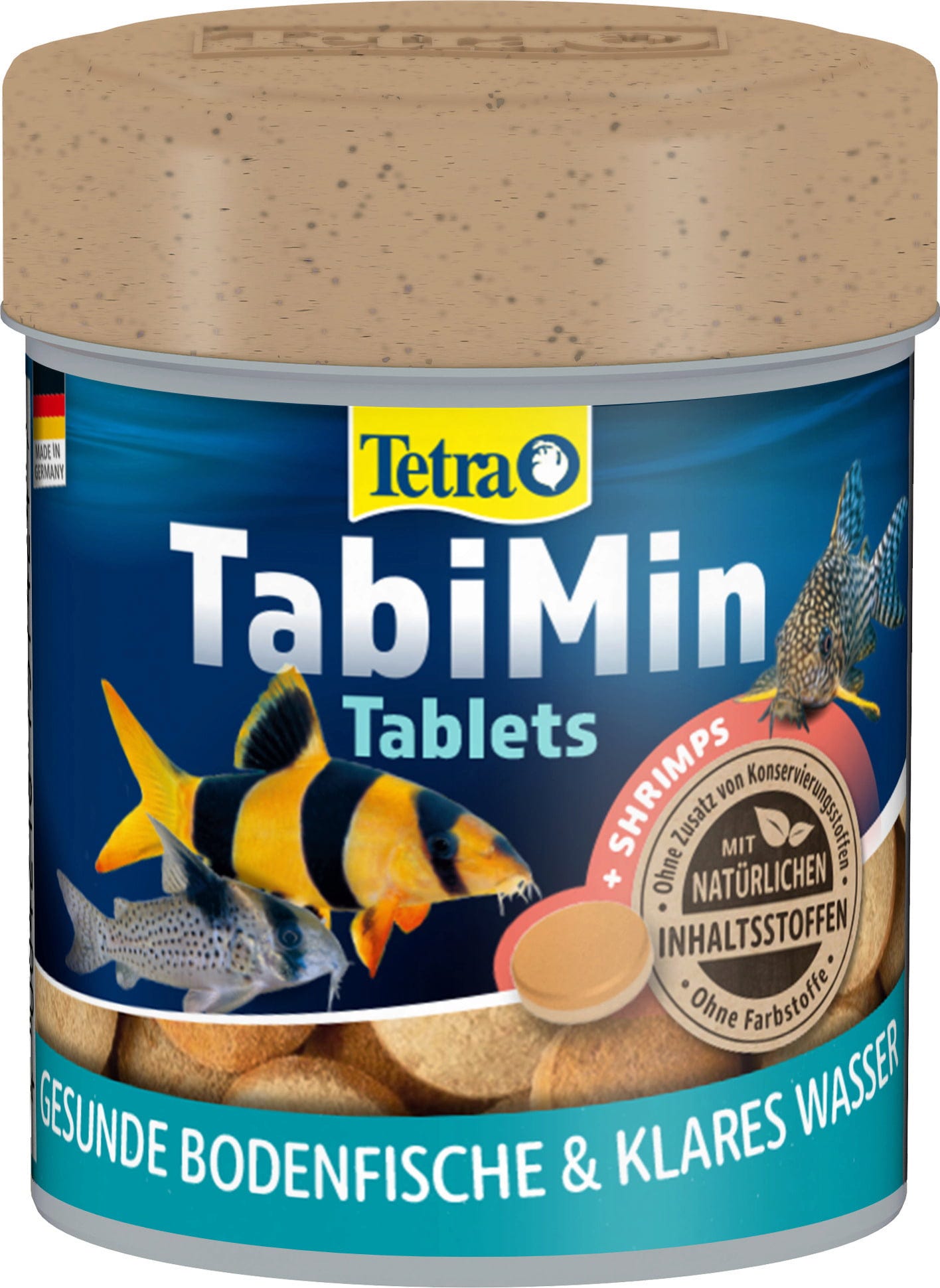 Tetra Tablets TabiMin är ett biologiskt balanserat, näringsrikt premiumfoder i tablettform för alla bottenlevande fiskar. Tabletterna sjunker snabbt, kan placeras på gömda ställen för skygga fiskar och löses upp långsamt för att underlätta utfodring utan att brytas ner eller grumla vattnet. Den nya formeln med flera tabletter innehåller räkor för bättre acceptans samt alla viktiga näringsämnen, vitaminer och mineraler. Sjögräs med många naturliga mineraler och karotionoider bidrar till en naturlig förstärkning av färgen. Tetra-mat är lättsmält - så vattnet förorenas mindre och förblir rent och klart.