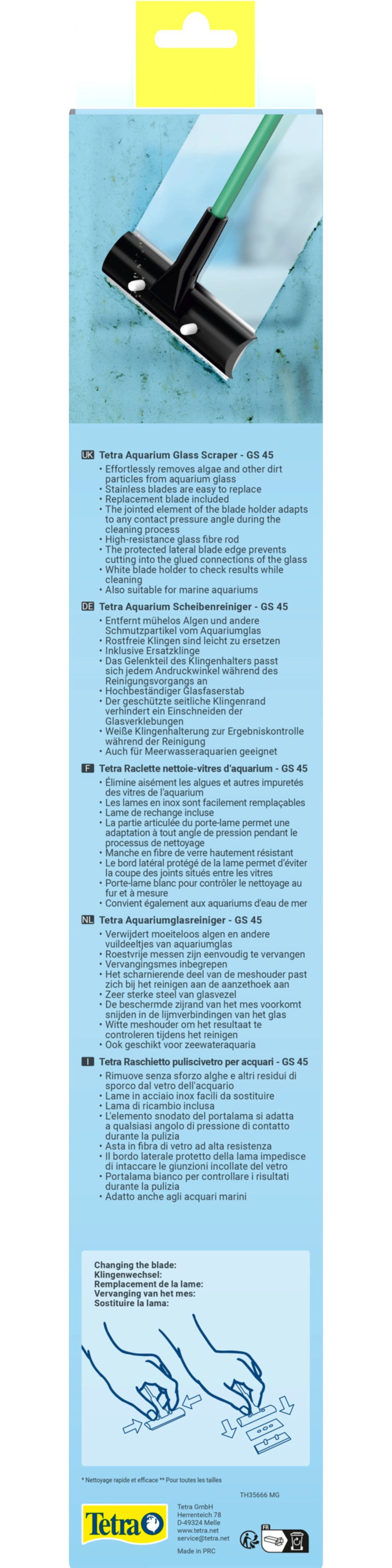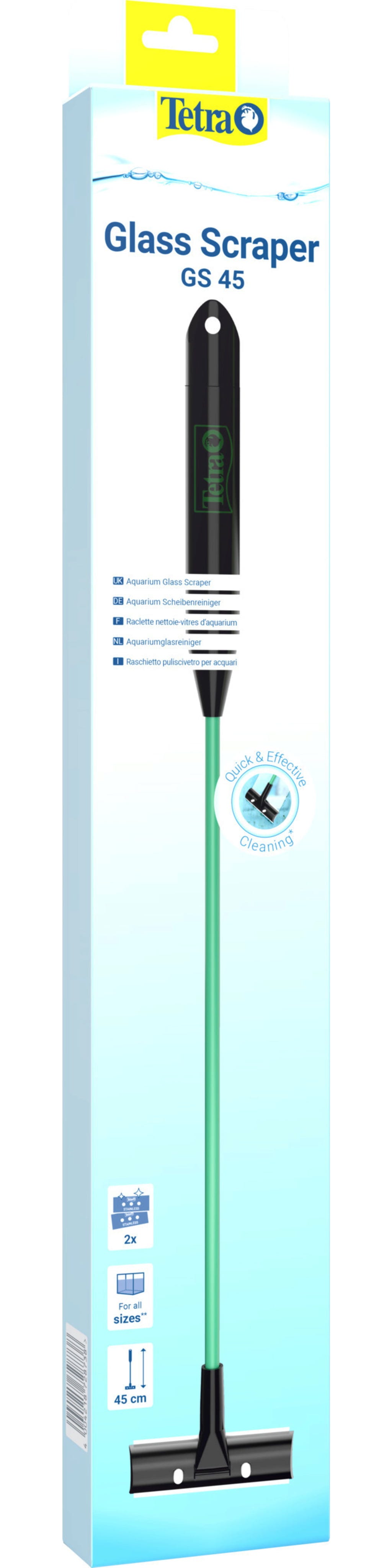 En optimal akvarievård omfattar även regelbunden rengöring av akvariets glasrutor. Alger och andra beläggningar sätter sig på insidan av rutorna och blir fula med tiden. För att du ska kunna se dina värdefulla fiskar och växter utan att de blir oskadade igen, bör du rengöra rutorna regelbundet och professionellt utan att skada dem. Med Tetra GS 45 Aquarium Pane Cleaner har Tetra ett professionellt verktyg som klarar av uppgiften: den 45 cm långa, brottsäkra glasfiberstången har ett robust plasthandtag med en upphängningsögla och en bladhållare i rostfritt stål, som gör att du utan ansträngning kan avlägsna alger, kalkavlagringar och andra smutspartiklar effektivt och snabbt utan att bli blöt om händerna. Den skyddade sidokanten på bladet förhindrar att det skär in i akvariets silikonlim. Den ledade delen av bladhållaren anpassar sig till alla tryckvinklar under rengöringen. Den vita bladhållaren gör det möjligt att kontrollera de ytor som redan har rengjorts. Alla blad är rostfria och lätt utbytbara, ett ersättningsblad ingår i glasrensaren. Tack vare det smala bladet kan du även nå smutskanten på gruslagret, vilket är svårt att rengöra med en magnetisk vindrutetvätt och riskerar att grusstenar kan repa vindrutan.