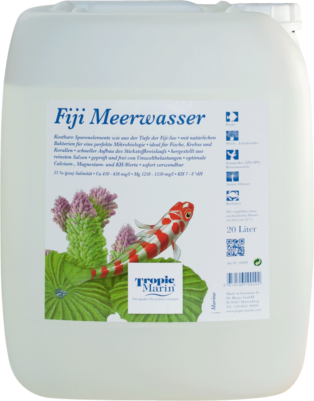 Fijis havsvatten innehåller högkvalitativa ämnen, bakterier och spårämnen för en naturlig mikrobiologi i akvariet. På så sätt regleras nitrat- och fosfatnivåerna i vattnet på ett naturligt sätt och kvävecykeln etableras. Det färdiga havsvattnet förser akvarier med kalcium, magnesium och karbonathårdhetsvärden som är anpassade till havet!