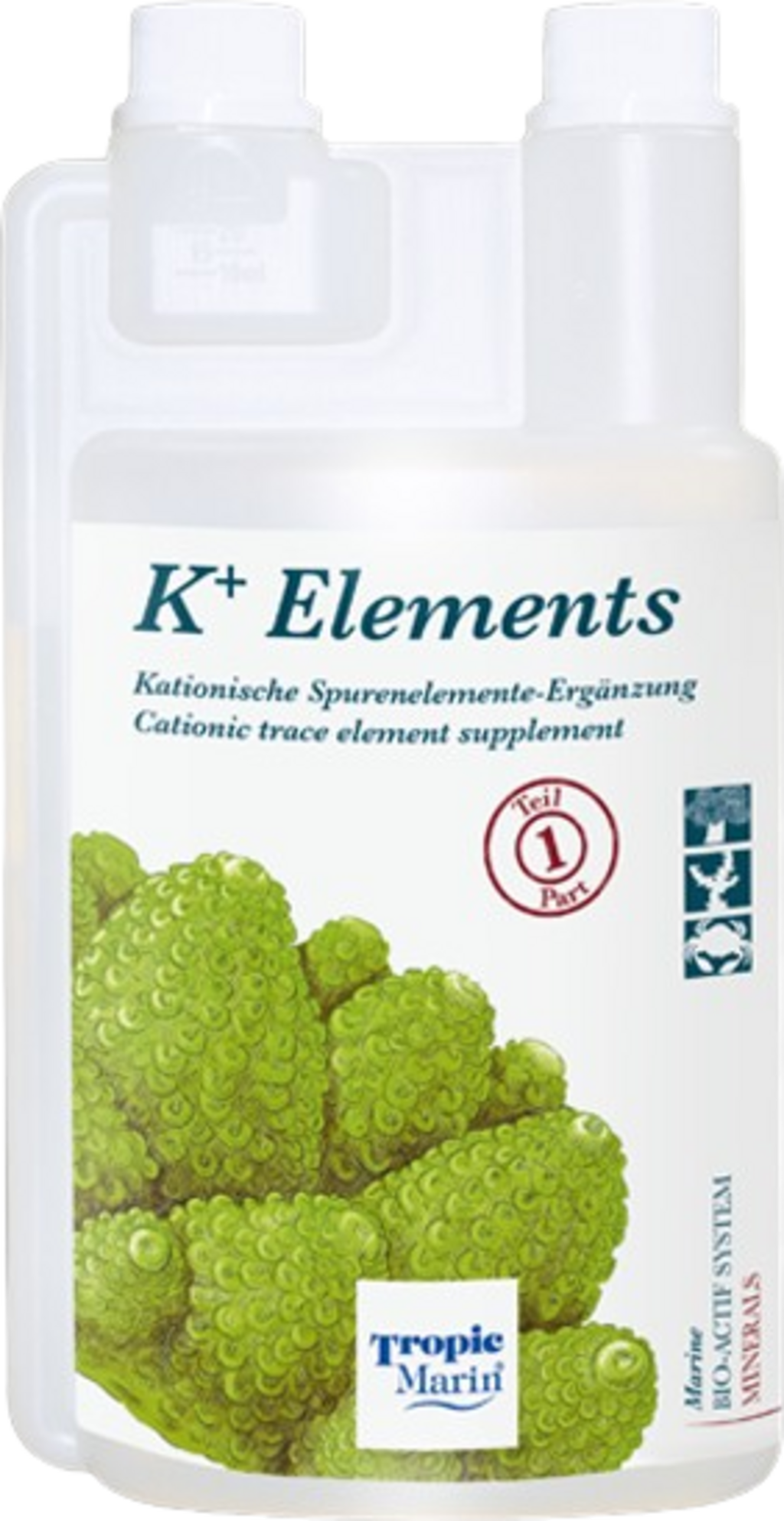 Tropic Marin K+ Elements är ett katjoniskt tillskott av spårämnen som innehåller barium, bor, krom, kobolt, järn, koppar, mangan, nickel, strontium och zink i ren mineralform. Det flytande preparatet stöder de naturliga och biologiska processerna i revakvarier och bidrar till korallernas vitalitet.