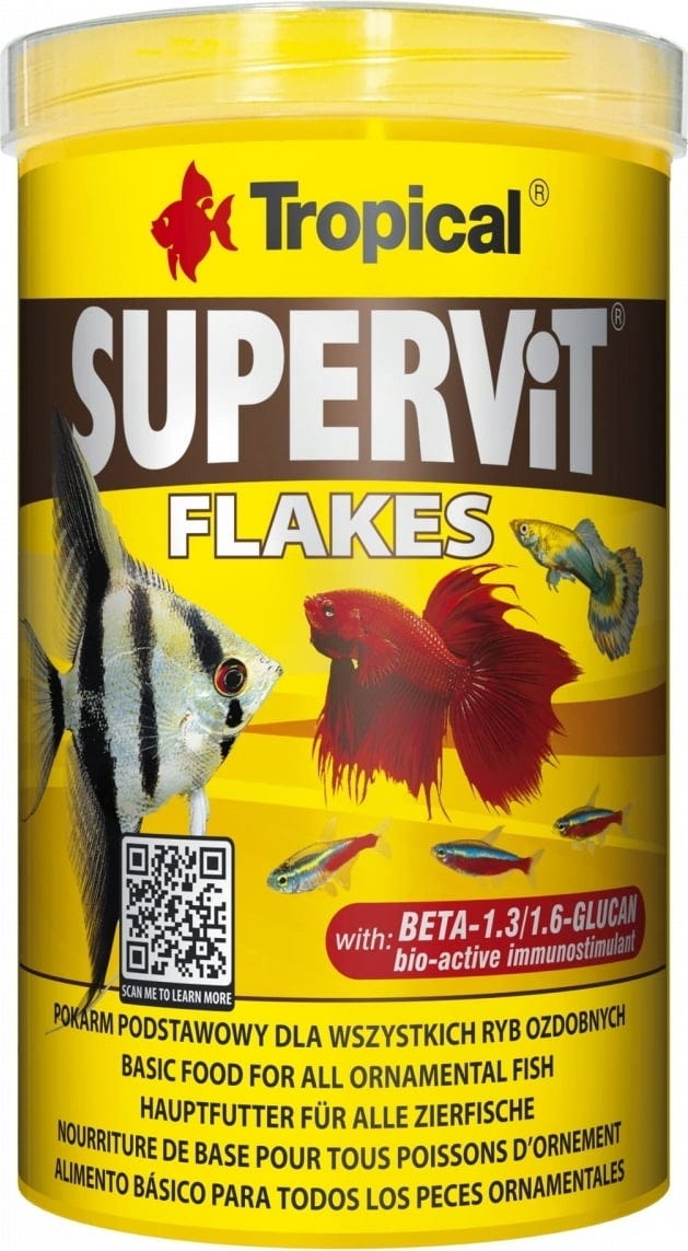 SUPERVIT är ett komplett foder av högsta kvalitet med flera ingredienser i flingform för daglig utfodring av alla akvariefiskar. Den består av ingredienser som tillgodoser de olika näringsbehoven hos fiskar som hålls i samhällsakvarier. Fodret innehåller det naturliga immunstimulerande ämnet beta-1,3/1,6-glukan och stabiliserat C-vitamin, som effektivt stöder fiskens immunförsvar och skyddar dem mot olika infektioner.